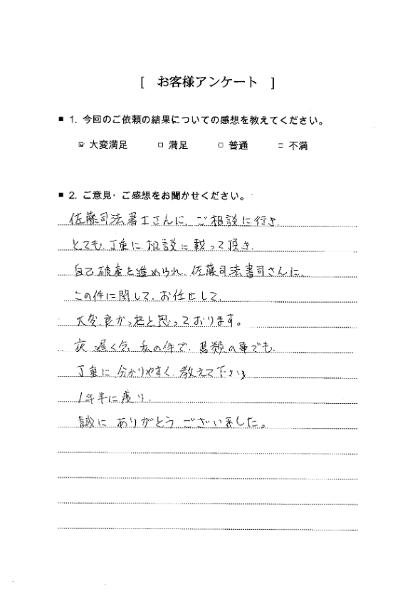 佐藤司法書士さんにご相談に行き、とても丁重に相談に乗って頂き、自己破産を進められ、佐藤司法書士さんにこの件に関して、お任せして大変良かったと思っております。 夜遅く迄、私の件で書類のことでも丁重に分かりやすく教えて下さり、1年半に渡り、誠にありがとうございました。